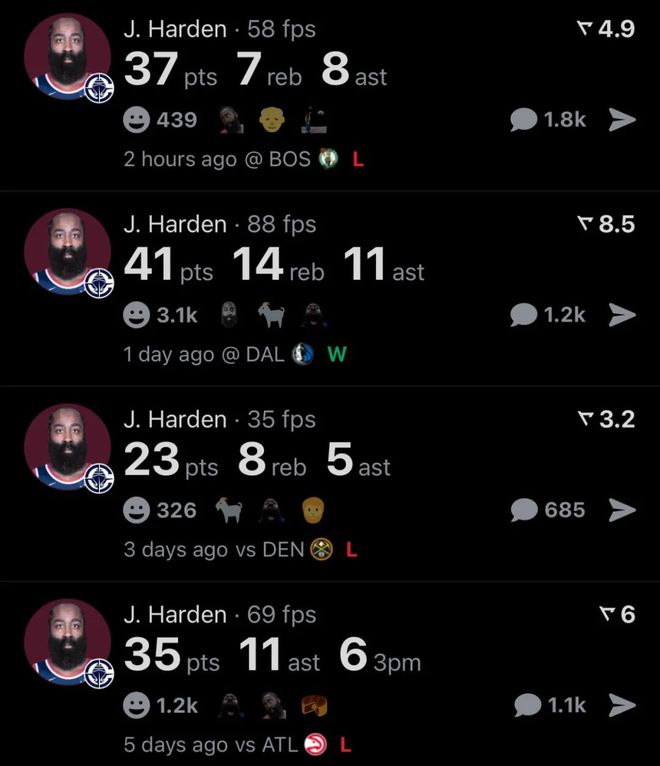 就过去四场比赛来说,哈登的表现:
