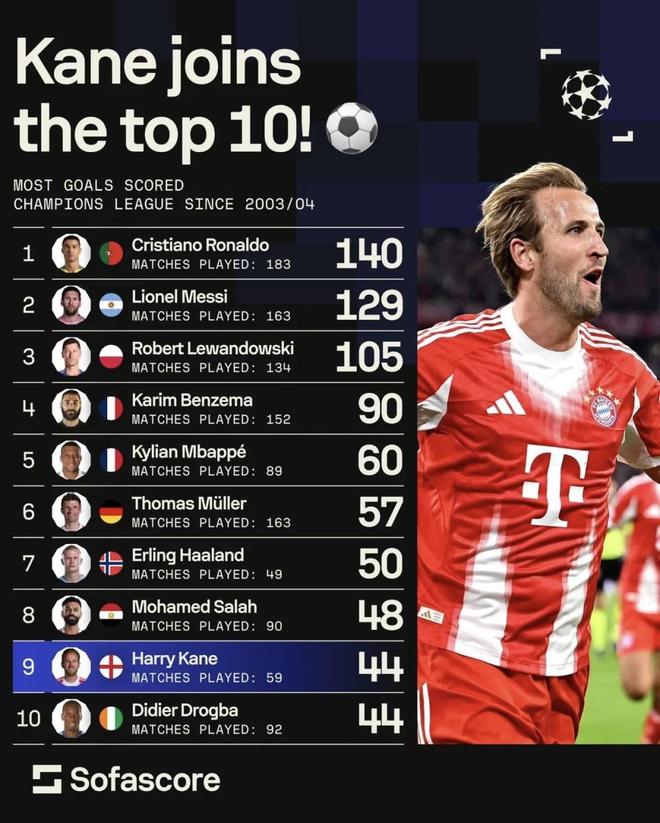 欧冠场均进球榜出炉!凯恩效率这么高?若早点去拜仁效率更逆天?