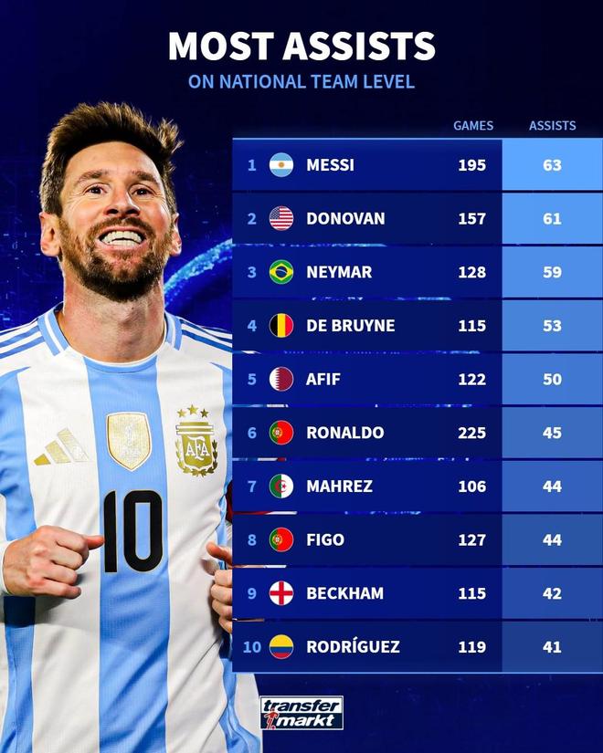 德国转会市场网站列出了历史国家队助攻榜,梅西以63次居首,多诺万以61次排名第二,内马尔以59次列第三。